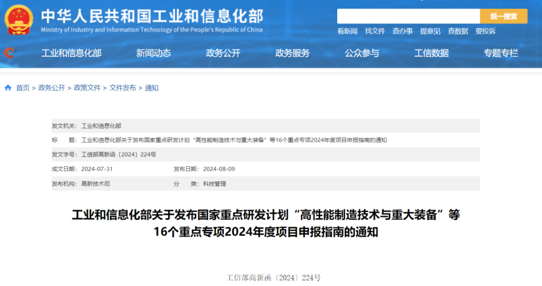 2024年度項目申報指南:關于發布國家重點研發計劃“高性能制造技術與重大裝備”等16個重點專項